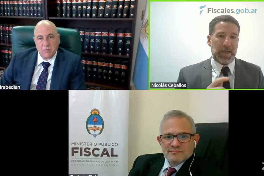 El fiscal general de Córdoba Maximiliano Hairabedian, el juez de Garantías de San Isidro Nicolás Ceballos y el funcionario de la UNISA Gustavo Plat, en la segunda clase del “Programa Nacional de Formación en el CPPF". Foto: captura de Zoom.