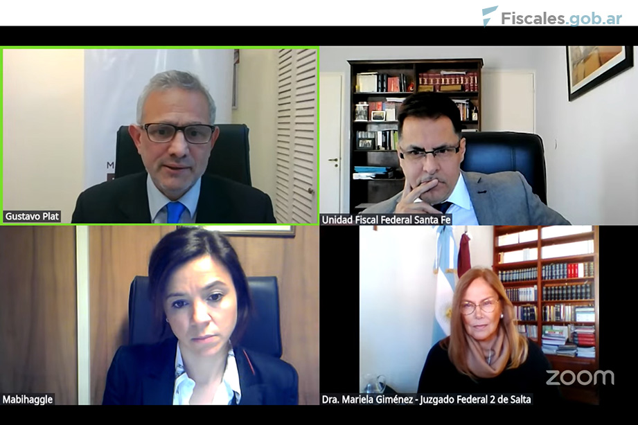 La cuarta clase del Programa Nacional de Formación en el CPPF tuvo como docentes al fiscal jefe de la Unidad Fiscal Santa Fe, Gustavo Onel; la fiscal federal subrogante de la Unidad Fiscal Mendoza, Eugenia Abihaggle; y la jueza federal de Garantías de Salta, Mariela Giménez. Foto: captura de Zoom.