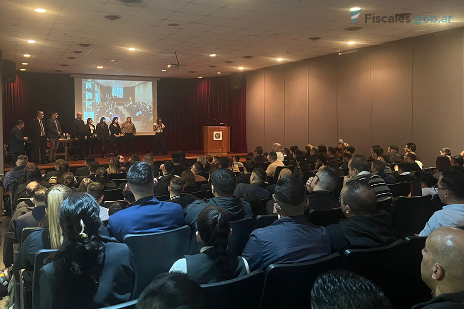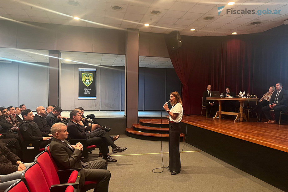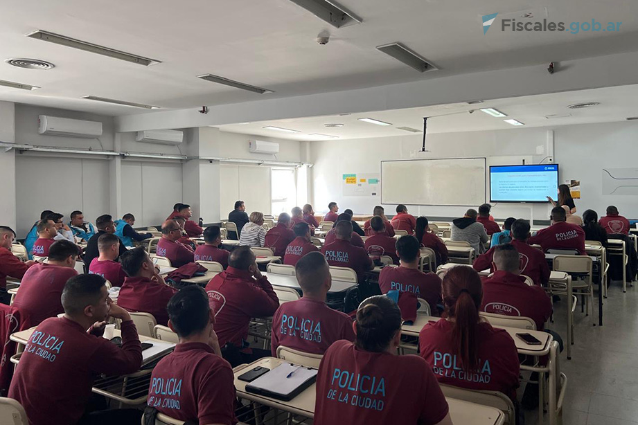 La primera actividad estuvo a cargo de María Sol Citate y Manuel Rogiano de la UNISA. Allí, ante 100 agentes de la Policía de la Ciudad de Buenos Aires, se abordaron los aspectos centrales del sistema acusatorio, los principios establecidos en el articulado del CPPF, las nuevas modalidades que plantea el sistema procesal en relación al rol que deben cumplir los/as miembros de las fuerzas de seguridad en el proceso acusatorio y las nuevas formas de comunicación e interacción con el Ministerio Público Fiscal, a través del uso del formulario de consulta inicial y de las actas aprobadas en la Resolución PGN 40/2019.