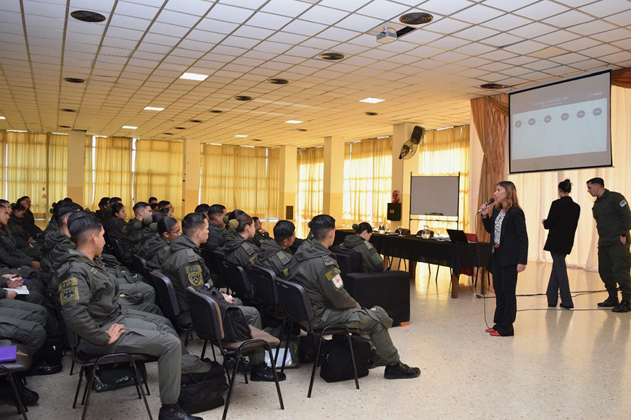 La coordinadora de la UNISA, Carla de Gangi, en la capacitación a 100 cadetes de la Escuela de Gendarmería Nacional General Don Martín Miguel de Güemes, ubicada en la localidad bonaerense de Ciudad Evita. Foto: UNISA.
