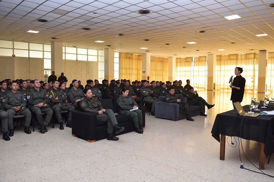 La coordinadora de la UNISA, Carla de Gangi, en la capacitación a 100 cadetes de la Escuela de Gendarmería Nacional General Don Martín Miguel de Güemes, ubicada en la localidad bonaerense de Ciudad Evita. Foto: UNISA.