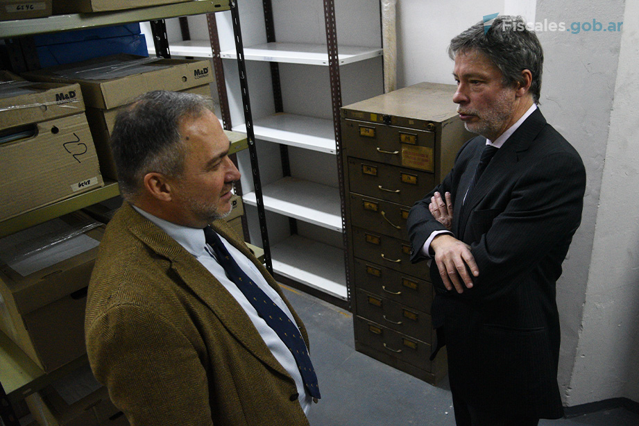 El juez federal Daniel Rafecas, el Ministro de Justicia y Derechos Humanos de la Nación, Martín Soria, e integrantes de las querellas de la causa AMIA -APEMIA, Memoria Activa y el Centro de Estudios Legales y Sociales- fueron recibidos el miércoles 6 de septiembre en la sede del Palacio Barolo por el fiscal federal cotitular de la Unidad Fiscal AMIA, Sebastián Basso, y el fiscal general a cargo del Área de Análisis de la Documentación de inteligencia desclasificada de esa unidad fiscal, Pablo Ouviña, en el marco de la inspección judicial dispuesta para constatar el traslado de los archivos de la exSIDE desclasificados por el Poder Ejecutivo Nacional para la investigación del atentado perpetrado el 18 de julio de 1994 a la sede de la Asociación Mutual Israelita Argentina.