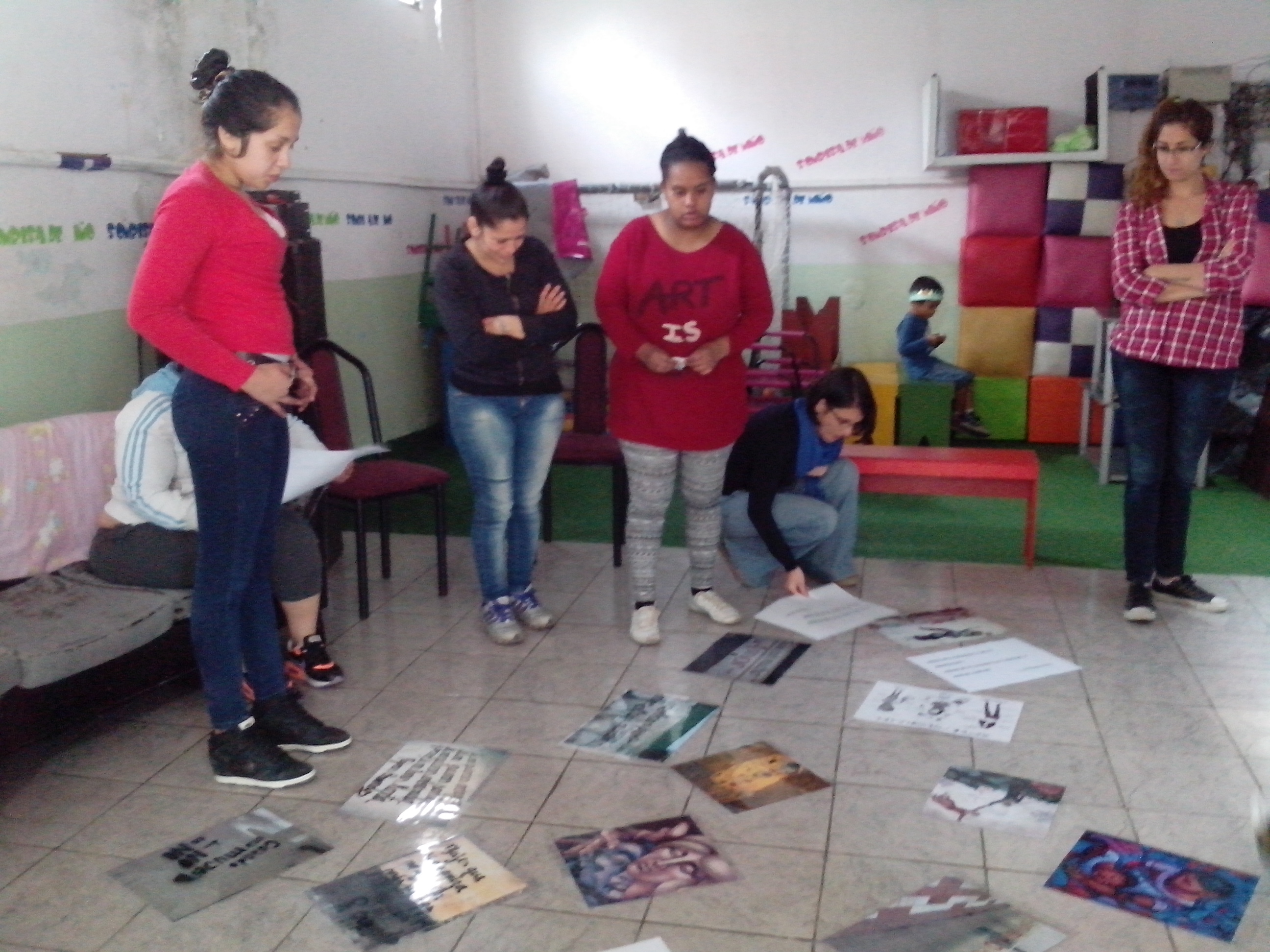 El objetivo fue reflexionar sobre las relaciones de pareja, el amor y la violencia. El disparador para promover la charla grupal fueron unas tarjetas con grafitis, imágenes y letras de canciones alusivas al amor, el rol de la mujer en la sociedad moderna y las relaciones de pareja. Cada participante debía entonces recorrer el espacio alrededor de las tarjetas, leer todas ellas, elegir una, y justificar ante el resto el porqué de la elección.