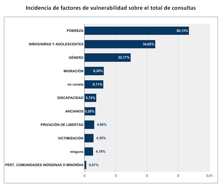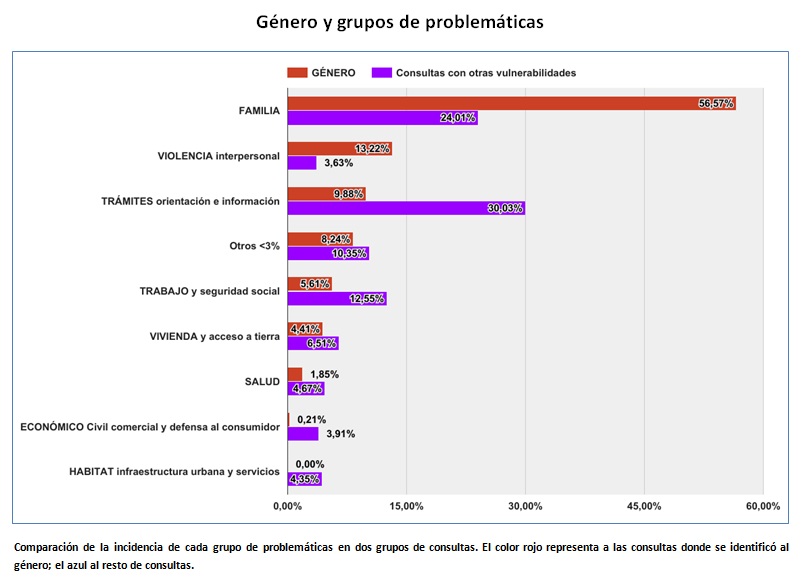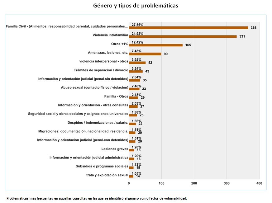 Al desagregar esos grupos de problemáticas que vinculan al género como factor de vulnerabilidad, las estadísticas muestran una marcada incidencia sobre consultas relacionadas a problemáticas civiles de familia, como alimentos y responsabilidad parental, y diversos tipos de violencia intrafamiliar.