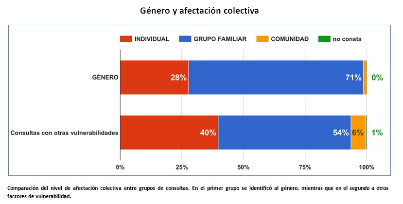 El relevamiento sobre el trabajo de los ATAJOs durante 2016 evidenció un alto grado de afectación colectiva sobre el grupo familiar en aquellas consultas que identificaron al género como factor de vulnerabilidad, llegando al 71%.