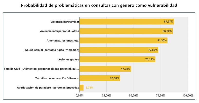 Finalmente, si se observan las problemáticas según probabilidad, entre las consultas atravesadas por el género (principalmente mujeres) hay un 87% más de probabilidades de sufrir violencia intrafamiliar que en el resto de las consultas.