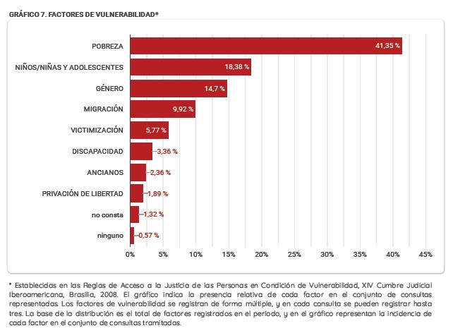 La variable “Pobreza”, con el 41,35% de los casos, representó el factor de vulnerabilidad más alto en los casos, no obstante cada consulta puede identificar hasta tres factores. Los factores “Niños/Niñas y Adolescentes”, y “Género” siguieron en importancia, con un 18,38% y un 17,7%, respectivamente.