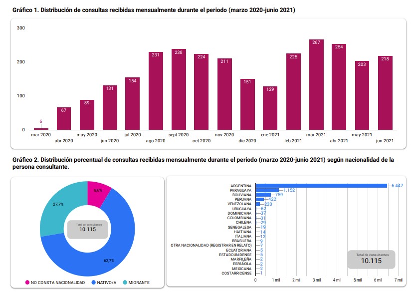 El área de Gestión de la Información de la Dirección General de Acceso a la Justicia (ATAJO) del Ministerio Público Fiscal de la Nación, elaboró un informe cuantitativo y cualitativo del que se desprende que, de las 10.115 consultas recibidas por las Agencias Territoriales de Acceso a la Justicia, en el periodo comprendido entre el 20 de marzo -cuando el Poder Ejecutivo Nacional dispuso el Aislamiento Social, Preventivo y Obligatorio (ASPO) a través del decreto N°297/20- y el 30 de junio de 2021, 3.668 (27,7%) fueron realizadas por personas no nacidas en territorio argentino.