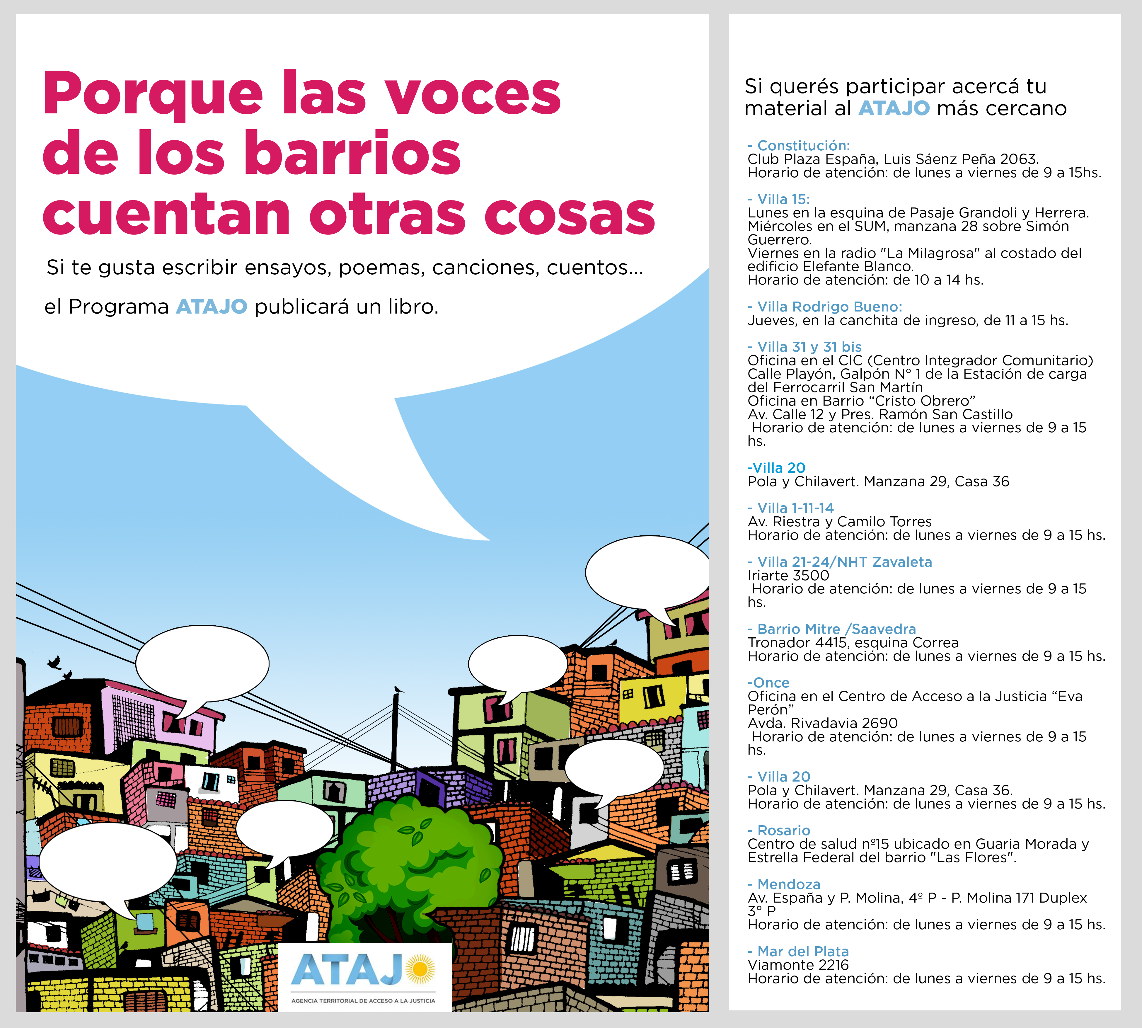 Las voces de los barrios cuentan otras cosas. Diferentes. Desconocidas por las voces que, ajenas a esos barrios, tergiversan lo que pasa en esos territorios. Esas voces del barrio cuentan a su modo. Con su propia voz. No la impostan. Son voces genuinas y evitan cualquier mediación. Para canalizar esa potencia expresiva, el Programa de Acceso Comunitario a la Justicia del MPF lanzó una convocatoria dirigida a poetas, letristas, cuentistas, raperos y dibujantes de los barrios donde se encuentran ubicadas sus agencias ATAJO, con la intención de reunir los trabajos que envíen los interesados en un libro de próxima aparición.