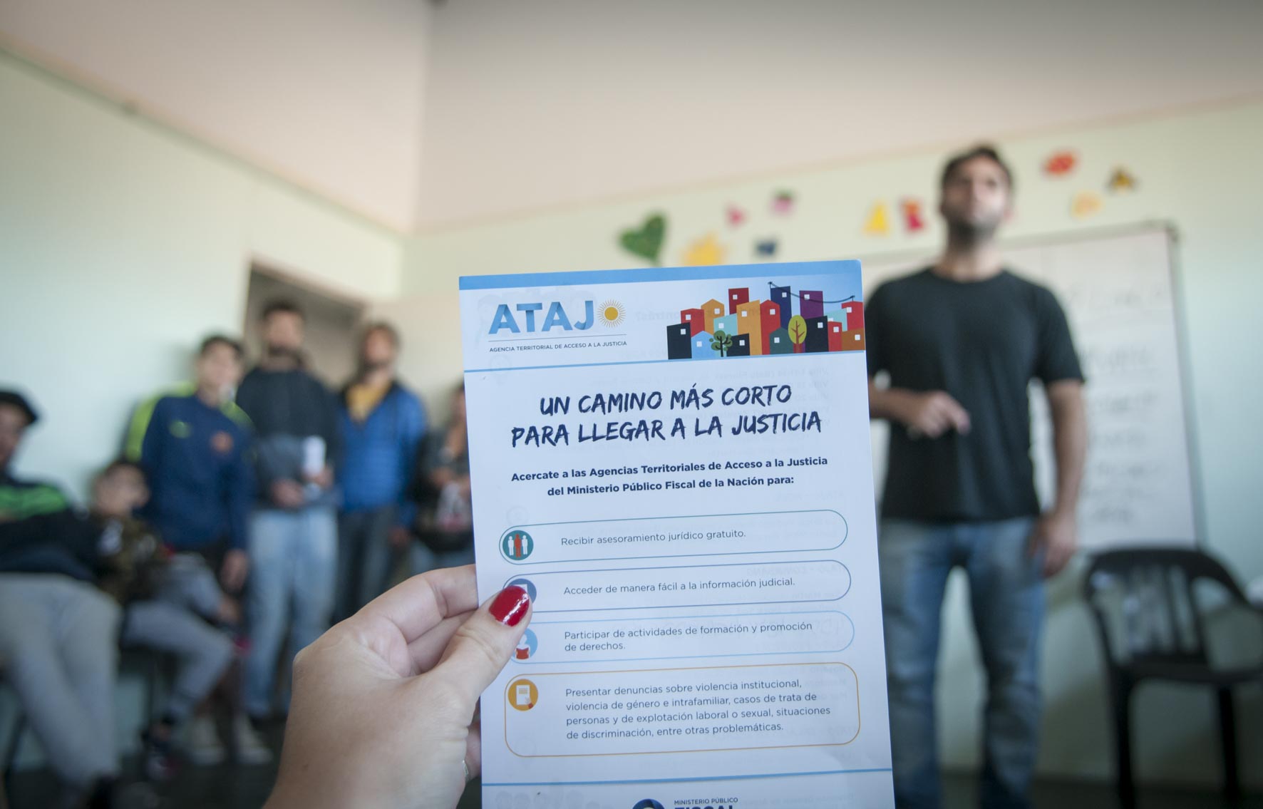 En la mañana del martes, el titular de la Dirección general de Acceso a la Justicia, Julián Axat, y la coordinadora de la agencia ATAJO del partido bonaerense de Avellaneda, Andrea Maza, junto al equipo de Formación y Promoción de derechos de ATAJO, realizaron un taller sobre poesía y derechos dirigido a jóvenes que participan del Programa de Responsabilidad Social Compartida "Envión", dependiente del Concejo Municipal de Avellaneda de Políticas de Inclusión y Nuevos Proyectos, el cual está destinado a chicos entre 12 y 21 años que se encuentran en situación de vulnerabilidad social.