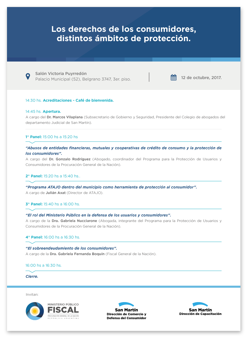 La apertura será realizada por el subsecretario de Gobierno y Seguridad del municipio y presidente del Colegio de Abogados del Departamento Judicial de San Martín, Marcos Vilaplana, a las 14:45. Los paneles comenzarán a las 15 y versarán sobre “Abusos de entidades financieras, mutuales y cooperativas de crédito de consumo y la protección de los consumidores” -en cabeza de Gonzalo Rodríguez, coordinador del Programa-; “Programa ATAJO dentro del municipio como herramienta de protección al consumidor” -en el que expondrá el director general de Acceso a la Justicia, Julián Axat-; “El rol del Ministerio Público en la defensa de los usuarios y consumidores” -en el que disertará Gabriela Nucciarone, integrante del Programa- y “El sobreendeudamiento de los consumidores” -a cargo de Gabriela Boquin, fiscal general ante la Cámara Nacional de Apelaciones en lo Comercial y titular del Programa de la PGN-.