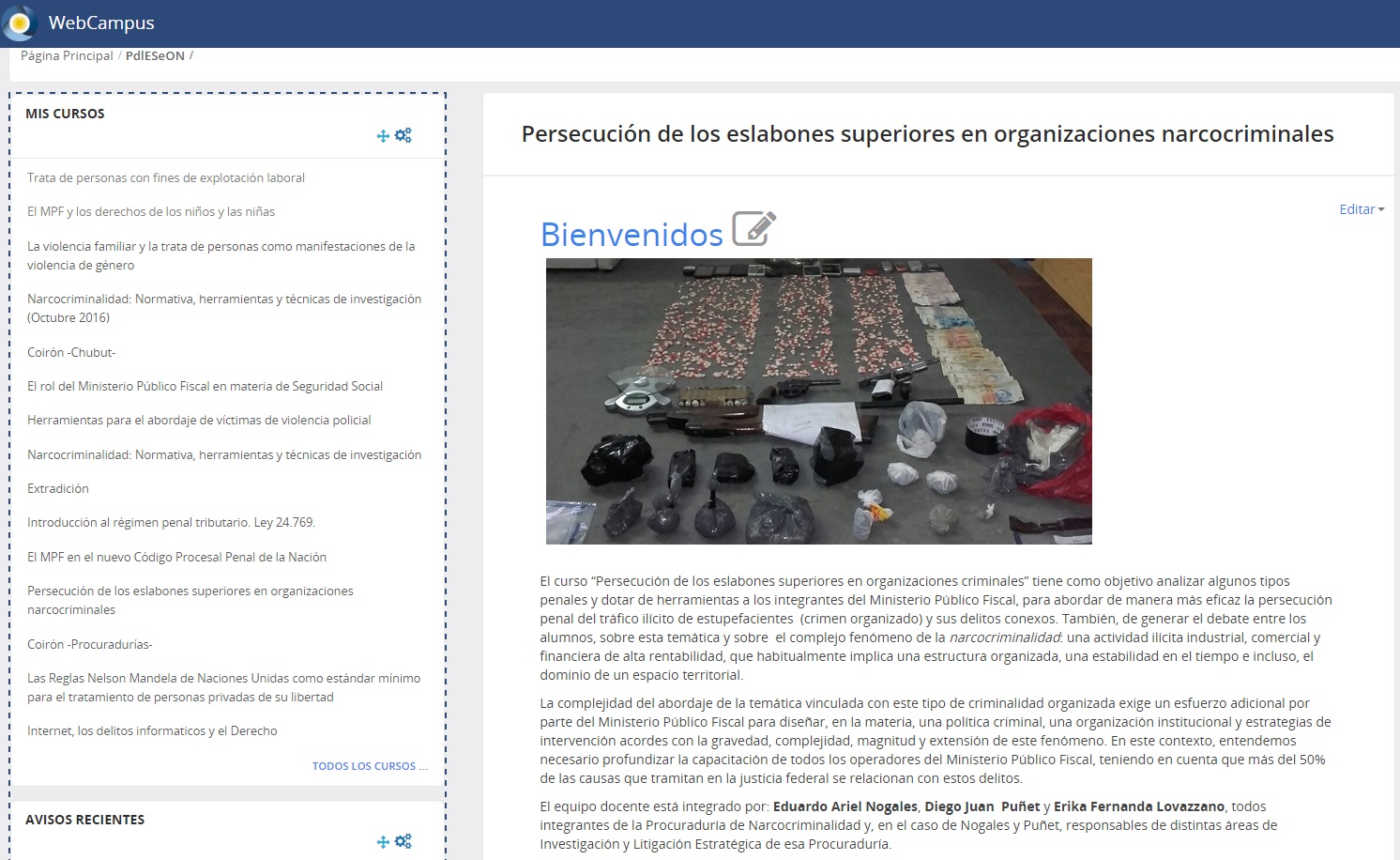 Organizado por el área de educación a distancia de la Dirección General de Capacitación y Escuela del MPF, finalizó ayer el curso “Persecución de los eslabones superiores en organizaciones criminales” dictado por un equipo docente de la Procuraduría de Narcocriminalidad (PROCUNAR), conformado por Eduardo Nogales, Diego Puñet y Érika Lovazzano.