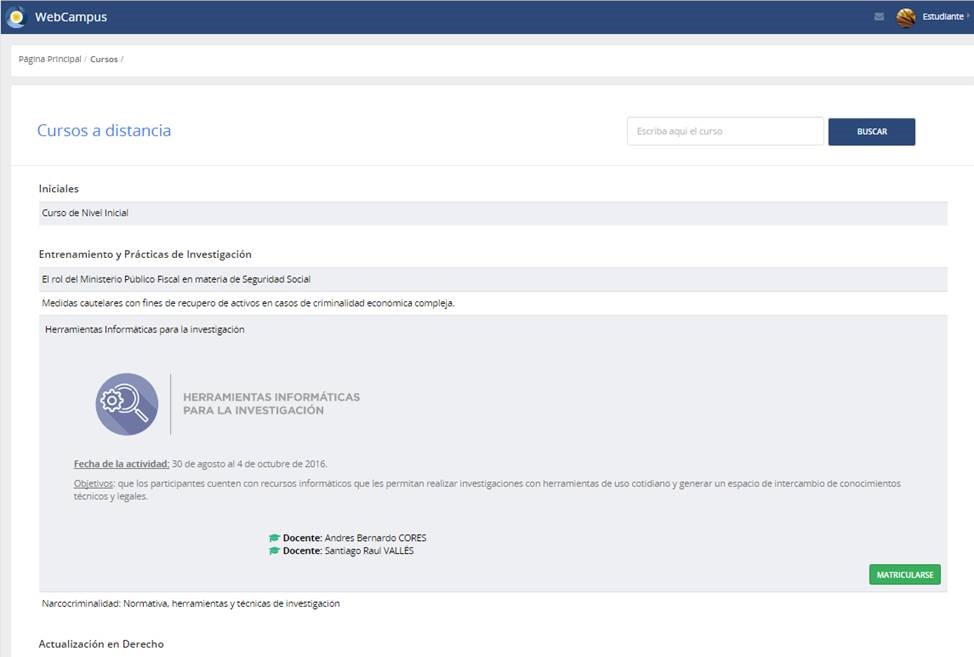 El webcampus del Ministerio Público Fiscal se halla actualmente implementado mediante Moodle, una aplicación de acceso libre y gratuito, utilizada mundialmente por universidades, centros de formación y organismos del sector público y privado. Parte de la innovación introducida consistió en migrar hacia la versión estable más moderna de dicho sistema, conocida como 3.1.0.