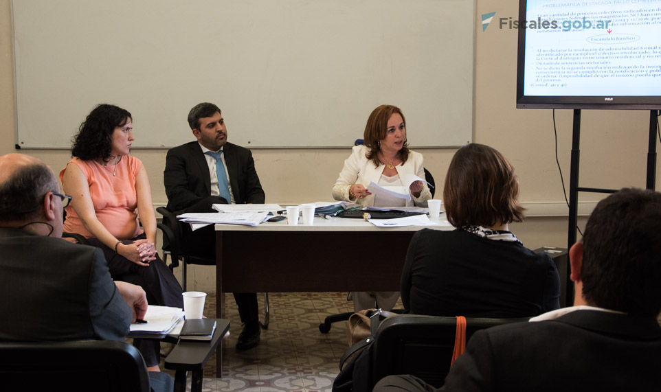 La fiscal general ante la Cámara Comercial, Gabriela Boquín, junto a parte del equipo que integra el Programa a su cargo, expuso sobre los aspectos generales que alcanzan a la temática. Al respecto, identificaron las problemáticas actuales que la unificación evidencia en la práctica cotidiana, los presupuestos de admisibilidad que la Corte Nacional ha fijado para la procedencia de dicha unificación, como así también las pautas que los jueces deberán cumplir en cada causa para analizar la viabilidad del nuevo “instituto procesal” y que fueron reiterados en el conocido fallo “CEPIS”, que declara la nulidad del incremento tarifario del gas y ordena la celebración de la audiencia pública.