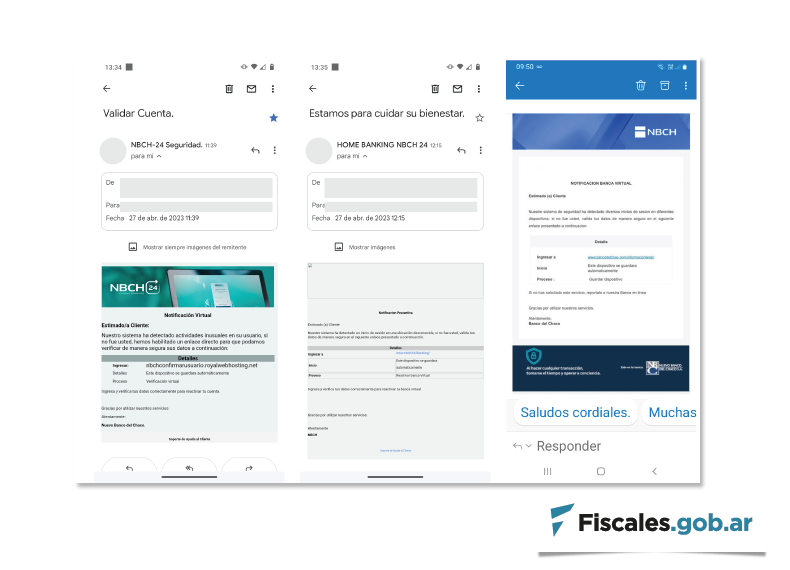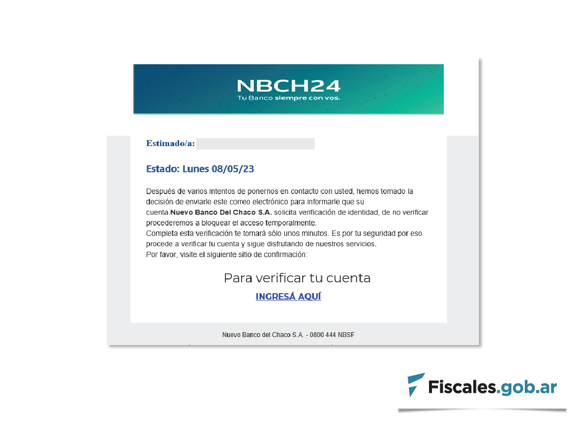 Por ejemplo, uno de ellos dice: “Después de varios intentos de ponernos en contacto con usted, hemos tomado la decisión de enviarle este correo electrónico para informarle que su cuenta Nuevo Banco Del Chaco S.A. solicita verificación de identidad, de no verificar procederemos a bloquear el acceso temporalmente. Completa esta verificación te tomará sólo unos minutos. Es por tu seguridad por eso procede a verificar tu cuenta y sigue disfrutando de nuestros servicios. Por favor, visite el siguiente sitio de confirmación”.