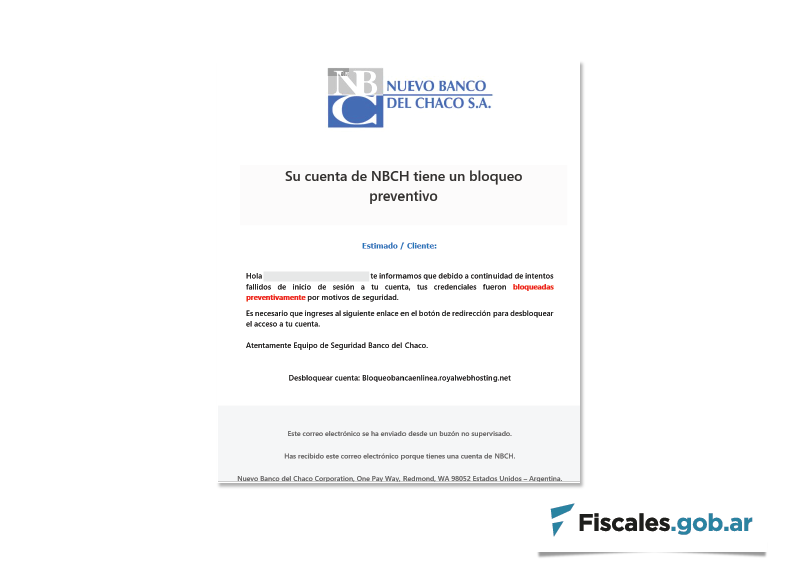 Otro mensaje, que consigna en el cuerpo del mensaje la dirección de correo electrónico del destinatario-víctima y lo torna próximo y verosímil, indica: "Hola te informamos que debido a continuidad de intentos fallidos de inicio de sesión a tu cuenta, tus credenciales fueron bloqueadas preventivamente por motivos de seguridad. Es necesario que ingreses al siguiente enlace en el botón de redirección para desbloquear el acceso a tu cuenta. Atentamente Equipo de Seguridad Banco del Chaco." (sic).