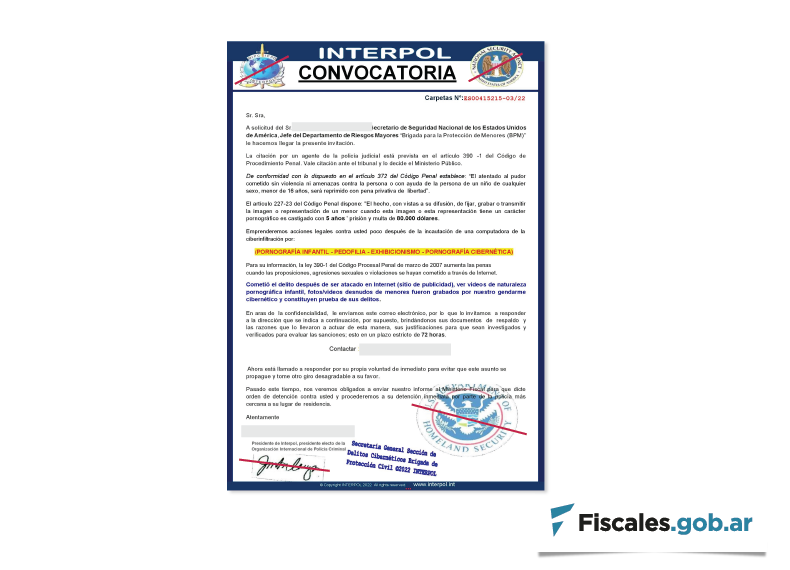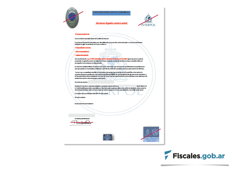 La Unidad Fiscal Especializada en Ciberdelincuencia (UFECI), a cargo del fiscal general Horacio Azzolín, informa sobre una nueva modalidad de estafas a través de correos electrónicos enviados a nombre de la Policía Federal Argentina (PFA) o Interpol en los que se advierte a las víctimas que existe en su contra una investigación penal por "pornografía infantil" y "ciberpornografía", entre otros aspectos, y se las amenaza con una "inminente orden de aprehensión a raíz de una incautación informática por ciberinfiltración en sus computadoras". Los mensajes buscan obtener datos personales de las víctimas a través de los "descargos" que produzcan frente a los delitos de los que se los acusa -como fotos de sus documentos, que luego puedan ser utilizados para otras maniobras- o, incluso, obtener dinero con un depósito de mil dólares en Bitcoins a cambio de cerrar la investigación.