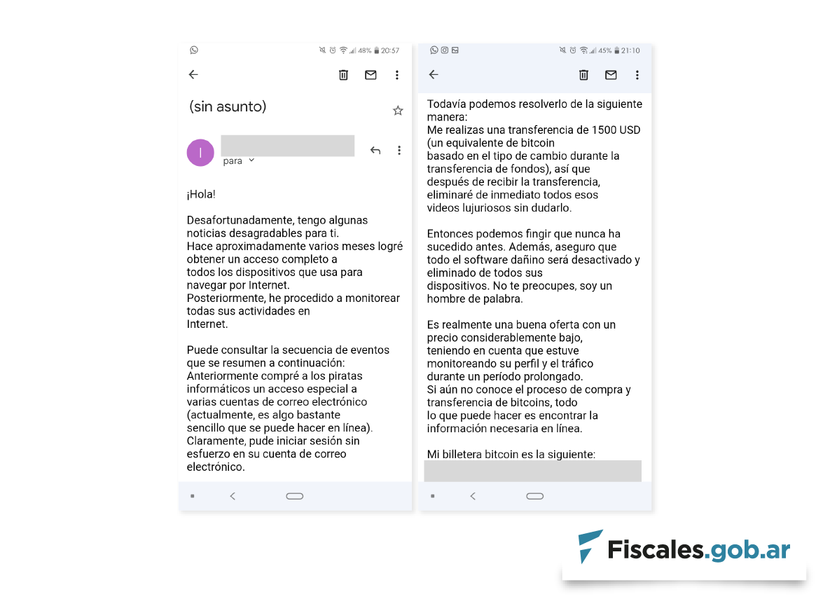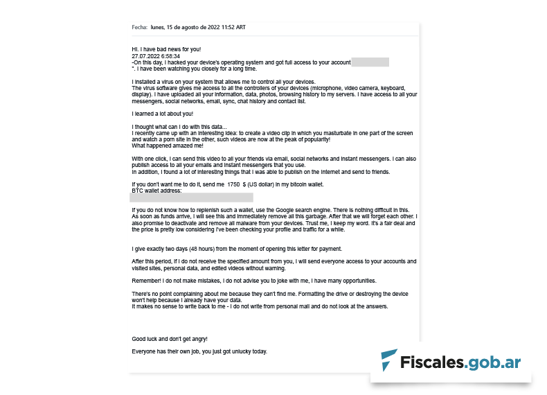 La Unidad Fiscal Especializada en Ciberdelincuencia (UFECI), a cargo del fiscal Horacio Azzolin, advirtió nuevamente sobre una modalidad de fraude por correo electrónico donde se le exige a la víctima una suma en dólares a través de una cuenta Bitcoin a cambio de no hacer pública información sobre su navegación en sitios de contenido pornográfico y de imágenes suyas mientras los miraba.