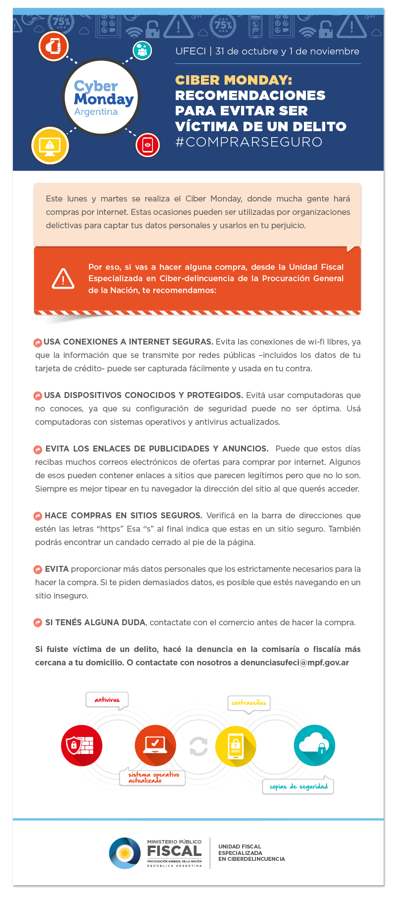 La Unidad Fiscal Especializada en Ciberdelincuencia recomienda utilizar conexiones a Internet y sitios seguros, dispositivos conocidos y protegidos, evitar los enlaces de publicidades y anuncios y, por último, no proporcionar más datos personales que los estrictamente necesarios para la operación.
