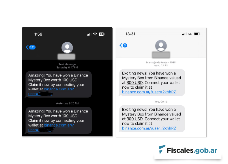 De acuerdo a la investigación preliminar, las víctimas eran contactadas a través de un mensaje de texto en el que se les informaba que habían recibido un premio “Mystery Box” valuado en 300 dólares. Para poder acreditarlo en su cuenta, los usuarios debían ingresar a un enlace que conducía al sitio apócrifo binance.com.ar (el original es binance.com, sin .ar).