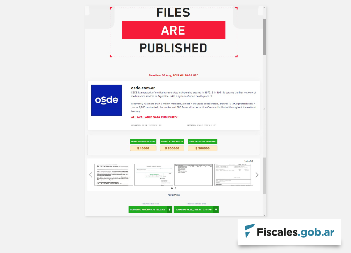 Transcurrido el plazo que dio la organización en el mensaje extorsivo, la información fue publicada en la deep web y está siendo descargada, por lo que desde la UFECI se documentó esa actividad para obtener evidencia para los investigadores y se denunció a OSDE ante la Dirección Nacional de Protección de Datos Personales por el defectuoso tratamiento/protección de los datos personales de sus clientes/pacientes, teniendo en cuenta especialmente que se trata de datos sensibles por incluir información sobre su salud.