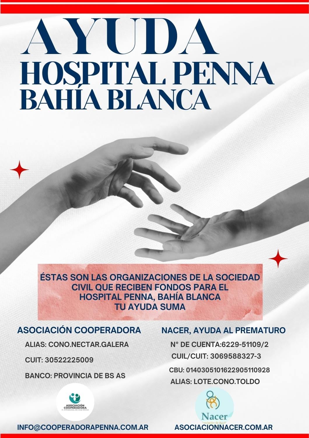 Por otra parte, otro lugar donde se pueden efectuar donaciones es al Hospital Interzonal General de Agudos Dr. José Penna de Bahía Blanca, que resultó severamente afectado por el temporal y las inundaciones. Estas son las cuentas bancarias de las organizaciones de la sociedad civil que reciben fondos para el hospital: