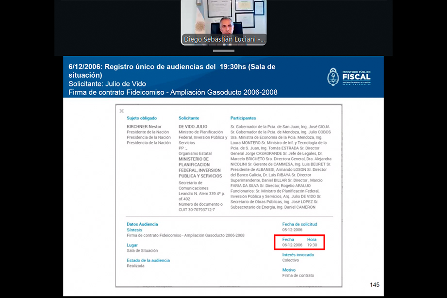 La fiscalía exhibió el registro de ingresos a Casa Rosada, donde se suscribió el contrato con la constructora brasileña.| Foto: captura de Zoom