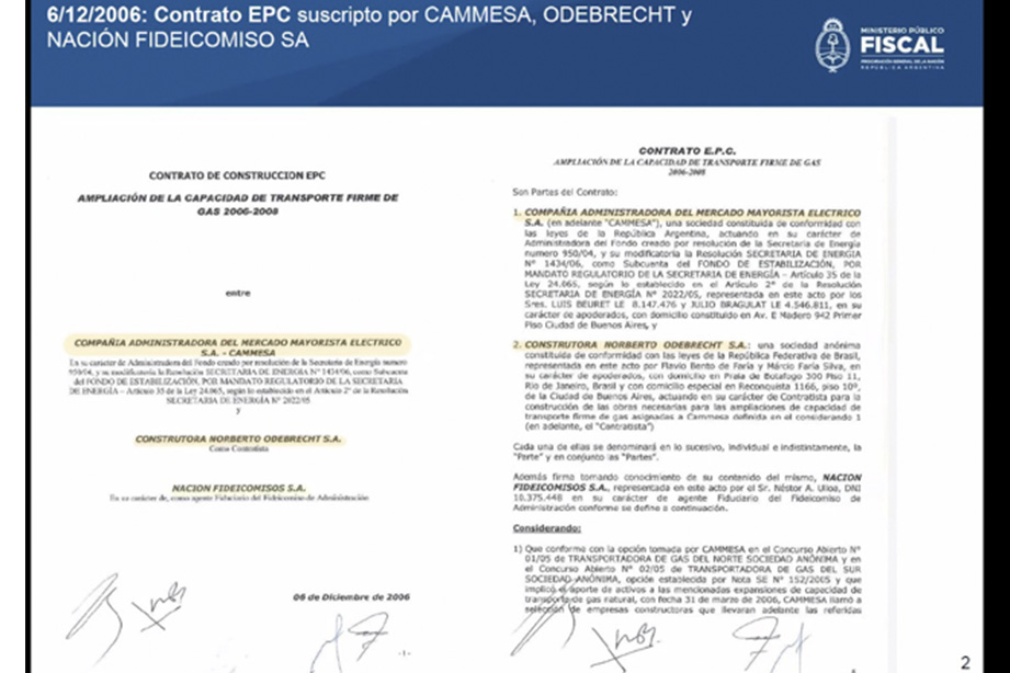 Al comienzo de la audiencia, el fiscal Luciani señaló cómo “a partir del mes de octubre de 2005, la firma Odebrecht se puso en contacto, de manera formal, con la Secretaría de Energía y con Cammesa, con el fin de colaborar con la ampliación de los gasoductos prevista para el período 2006-2008”. Para ello se propuso como contratista “cuando todavía no estaba abierto el concurso de posibles oferentes que luego llevaría adelante CAMMESA, por cuenta del Estado Nacional”.