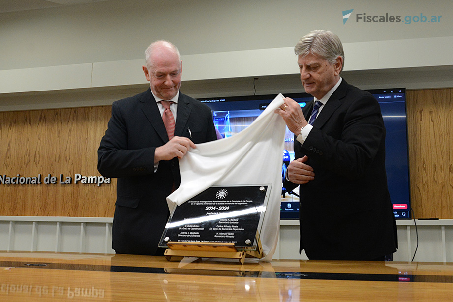 El fiscal general de la Fiscalía de Investigaciones Administrativas de La Pampa, Juan Carlos Carola, y el gobernador de la provincia de La Pampa, Sergio Ziliotto, descubren una placa por el vigésimo aniversario de la Fiscalía de Investigaciones Administrativas provincial. Foto: M. Tedín
