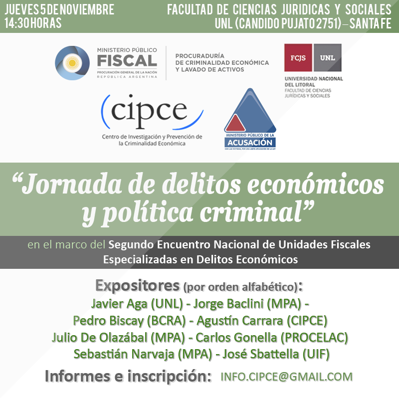 El encuentro está destinado al público general y es organizado conjuntamente por la Red de Unidades Fiscales Especializadas en Delitos Económicos (RedUFEDE), el Centro de Investigación y Prevención de la Criminalidad Económica (CIPCE), la Procuración General de la Nación y el Ministerio Público de la Acusación de la Provincia de Santa Fe.