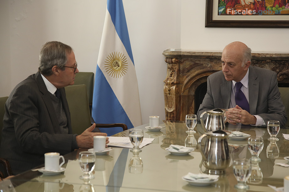 El procurador general de la Nación interino, Eduardo Casal, se reunió esta mañana con Michael Hopmeier, juez del Tribunal Penal Superior de Southwark, Londres, en el marco de la visita del magistrado a nuestro país para dictar un simposio sobre Lavado y Recupero de Activos en la Residencia del embajador británico en Buenos Aires. El encuentro tuvo lugar en la sede de la Procuración General de la Nación ubicada en Tte. Gral. Perón 667.