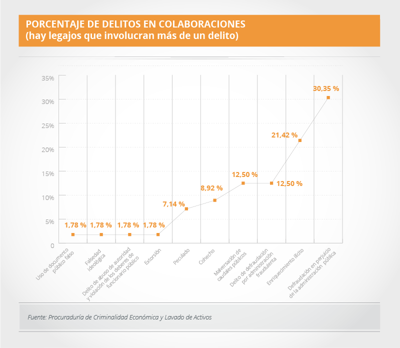 Asimismo, se informó que, en orden a los delitos investigados, "se advierte una preponderancia de defraudaciones en perjuicio de la administración pública (30,35%) y enriquecimientos ilícitos (21,42%). El resto se divide entre defraudaciones por administración fraudulenta (12,5%), malversaciones de caudales públicos (12,5%), cohecho (8,92%), peculado (7,14%), entre otros".