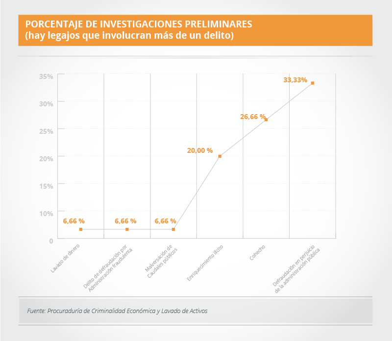 "Discriminadas por delito, las investigaciones preliminares muestran una predominancia de defraudaciones en perjuicio de la administración pública (33,33%), cohechos (26,66%) y enriquecimientos ilícitos (20%). El resto se divide entre malversaciones de caudales públicos, administraciones fraudulentas y maniobras de lavado de dinero", describió en su informe a Fiscales el área a cargo de Milton Khaski.