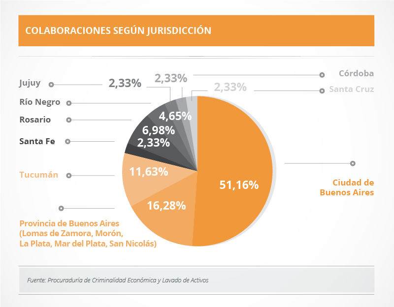 Desde el Área de Delitos contra la Administración Pública de la Procelac, a cargo de Milton Khaski, se informó a Fiscales que "los índices revelan una marcada tendencia hacia la federalización de las asistencias, de las cuales la mitad se encuentran destinadas a fiscalías del interior del país. Así, mientras el 51,16% corresponde a la Ciudad de Buenos Aires, el 16,28% a la Provincia de Buenos Aires, el 11,63% a Tucumán, el 9,3% a Santa Fe y el 2,33% a Córdoba, al igual que para Jujuy y Santa Cruz".