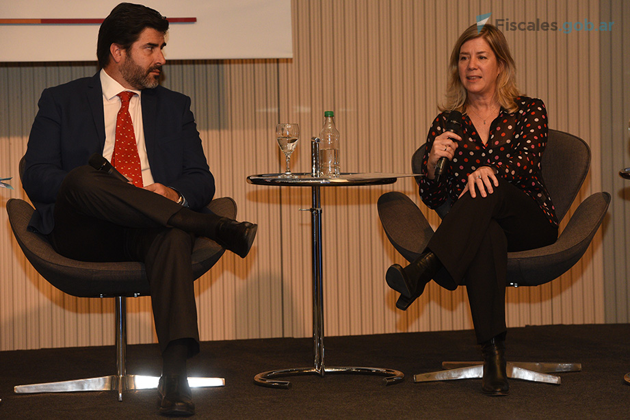 La fiscal Roteta abordó cuestiones relativas a la investigación de delitos de criminalidad económica compleja. Destacó a la Ley 27.401 como una herramienta que permite avanzar con imputaciones que vayan más allá de los eslabones más bajos de la responsabilidad, y que sortea la dificultad que se observaba anteriormente para llegar a los órganos directivos de la empresa a través de responsabilidades individuales. Roteta subrayó asimismo la importancia de la armonización que se logró en la legislación argentina con la de otros países, con los cuales -explicó- necesariamente debe mantenerse una colaboración en las investigaciones y acciones de recupero, o sanciones económicas.
