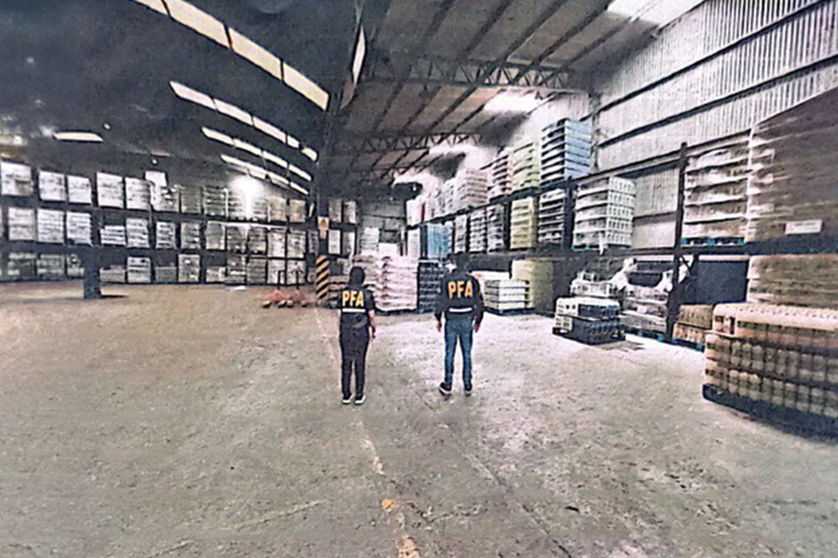 Dos efectivos de la Policía Federal en uno de los galpones de la empresa allanados. Foto: PFA.