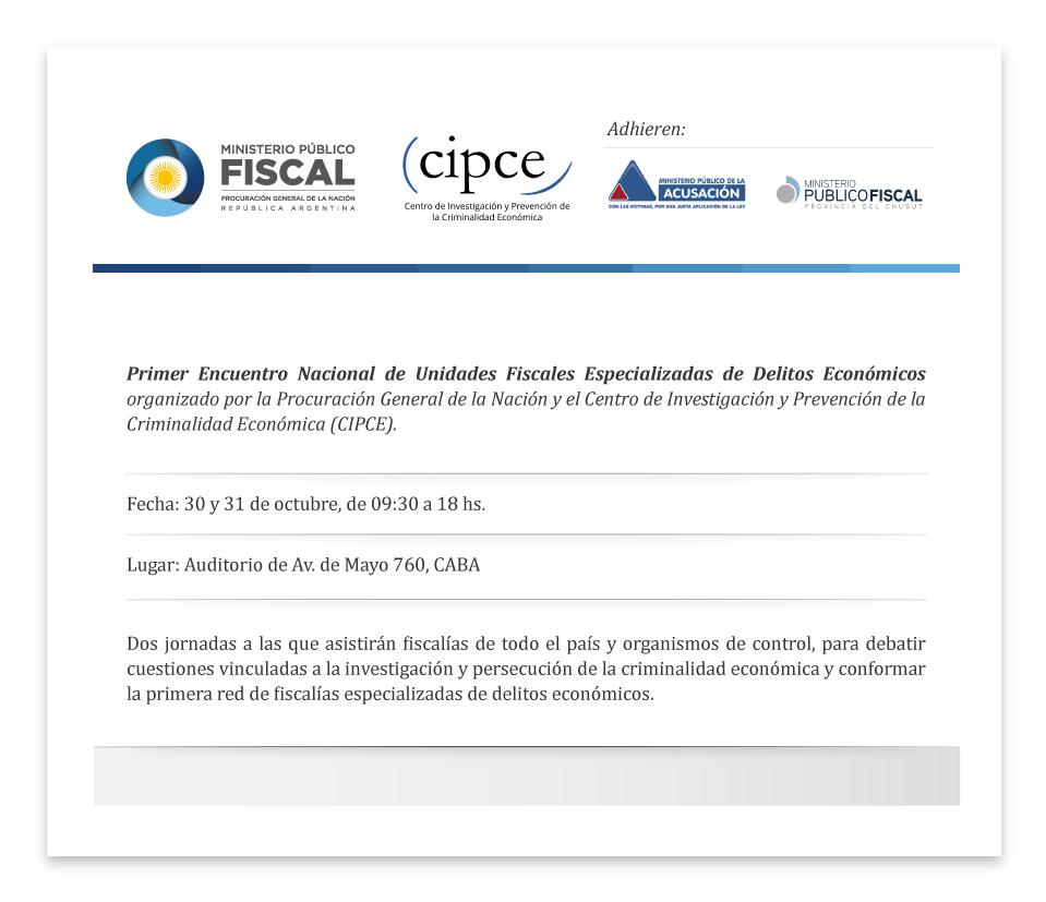 El 30 y 31 de octubre, se realizará el primer Encuentro Nacional de Unidades Fiscales Especializadas en Delitos Económicos, en la sede de Avenida de Mayo 760 de la Procuración General de la Nación. Las jornadas están organizadas junto con el Centro de Investigación y Prevención de la Criminalidad Económica (CIPCE). El Ministerio Público de la Acusación de Santa Fe y el Ministerio Público Fiscal de Chubut también manifestaron su adhesión.