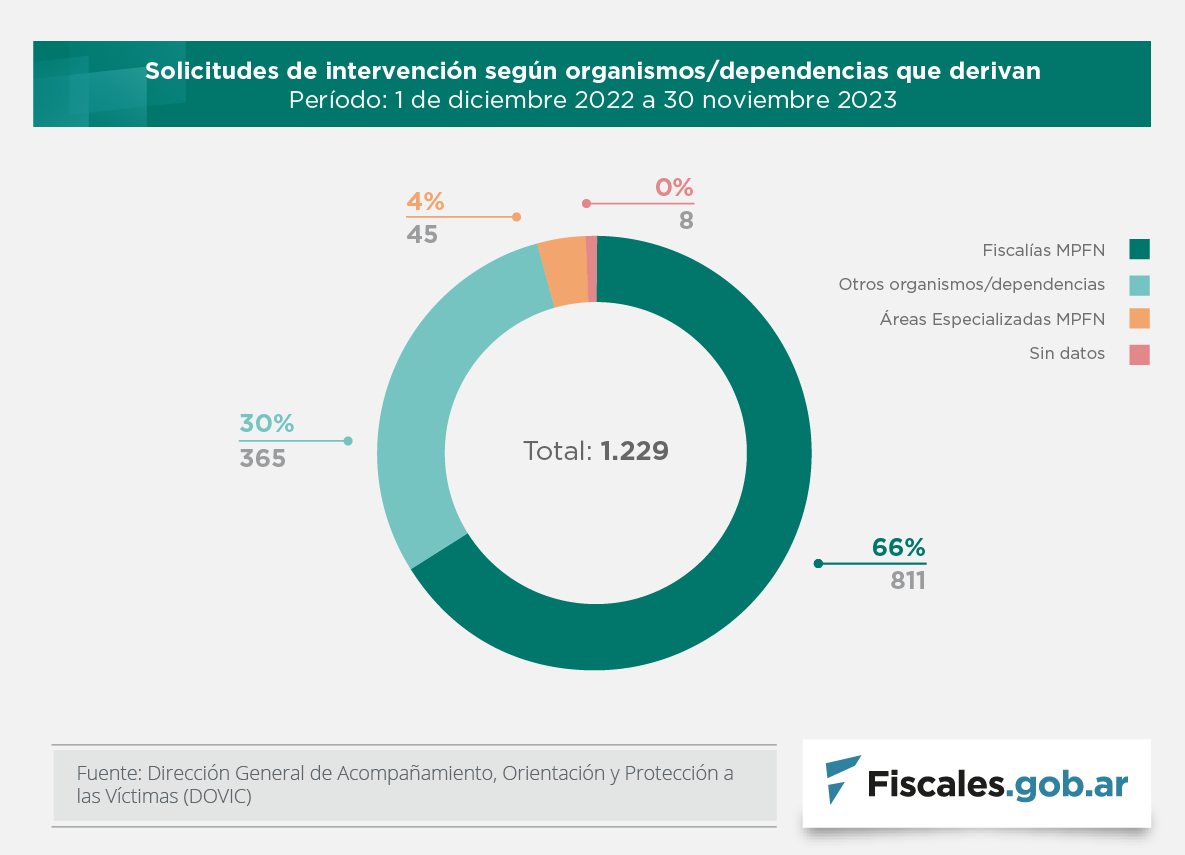 De acuerdo a los datos registrados, el 66% de las solitudes de intervención fueron derivadas por fiscalías del Ministerio Público Fiscal de la Nación, mientras que el 30% provinieron de otros organismos y dependencias. En este universo se destaca el ingreso a partir de las demandas espontáneas de víctimas, con un total de 198. El informe pone de relieve que, al solicitarse la intervención de la DOVIC en la etapa de instrucción, se posibilita el acompañamiento de las víctimas en todas las instancias del proceso penal y el desarrollo de estrategias de acompañamiento integrales.