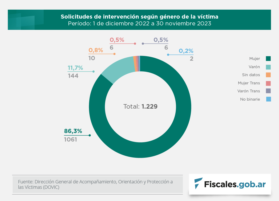 De acuerdo al informe, el 86,3% de las víctimas acompañadas por la DOVIC son mujeres. Se registran 11,7% varones, 0,5% mujeres trans, 0,5% de varones trans y 0,2% de personas no binarias. El 62% de las solicitudes de intervención corresponde a personas adultas y 20% a niñas, niños y adolescentes