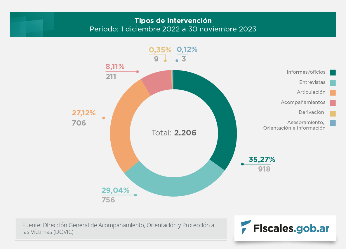 Dentro del universo de intervenciones que realizan las y los profesionales del área con el objetivo de orientar, acompañar y asistir a las personas que solicitan intervención, se destaca que el 35,2% corresponde a informes y oficios, el 29% a entrevistas con las víctimas –presenciales y virtuales - y el 27,12% a articulaciones con otros organismos y dependencias.