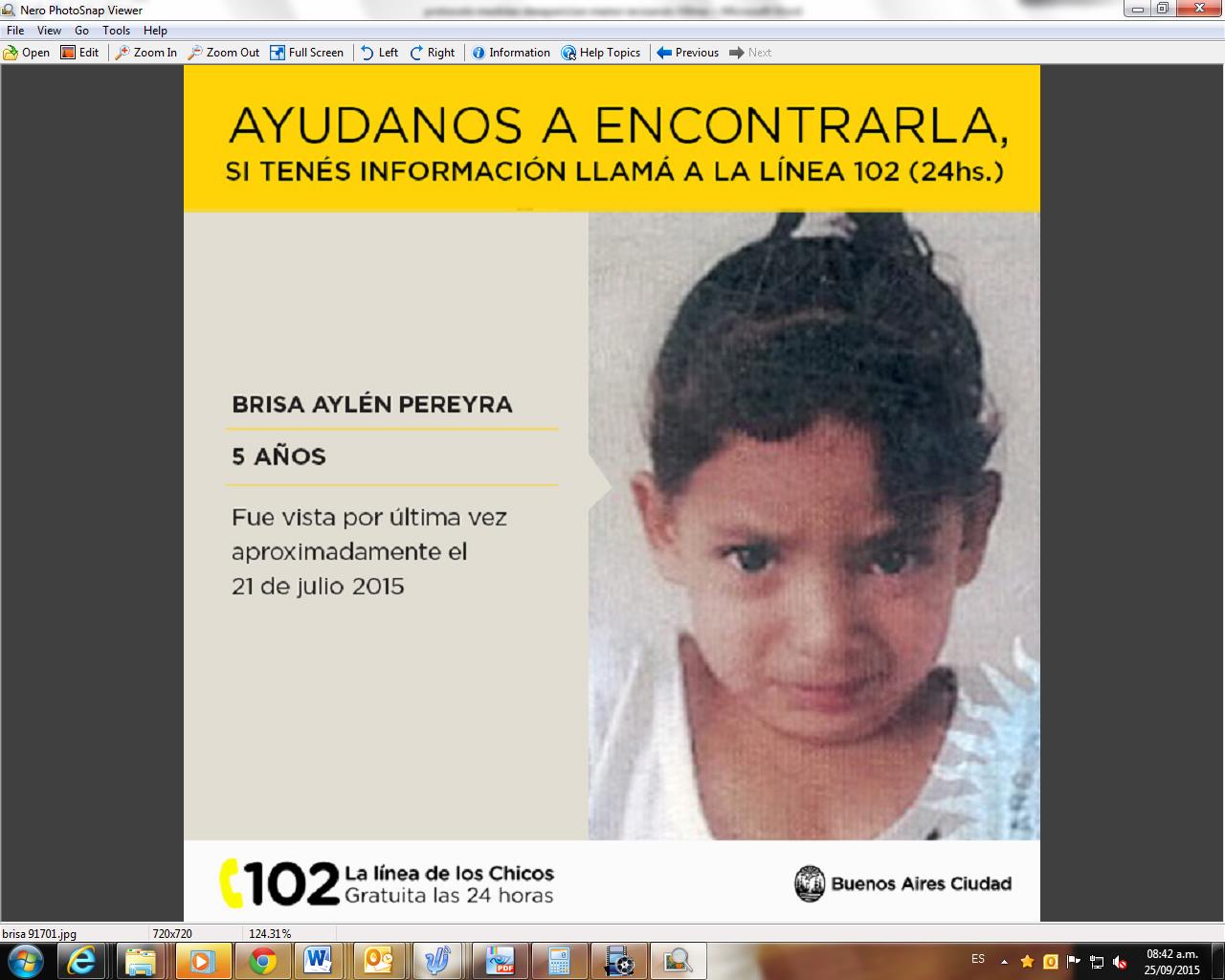 La Fiscalía de Distrito de los barrios de Nueva Pompeya y Parque de los Patricios solicita a los ciudadanos la colaboración para dar con el paradero de Brisa Pereyra, de cinco años de edad. La niña se encuentra desaparecida desde el 21 de julio pasado, cuando fue vista en la intersección de las calles Alvarado y Agustín Magaldi, de la Ciudad Autónoma de Buenos Aires.