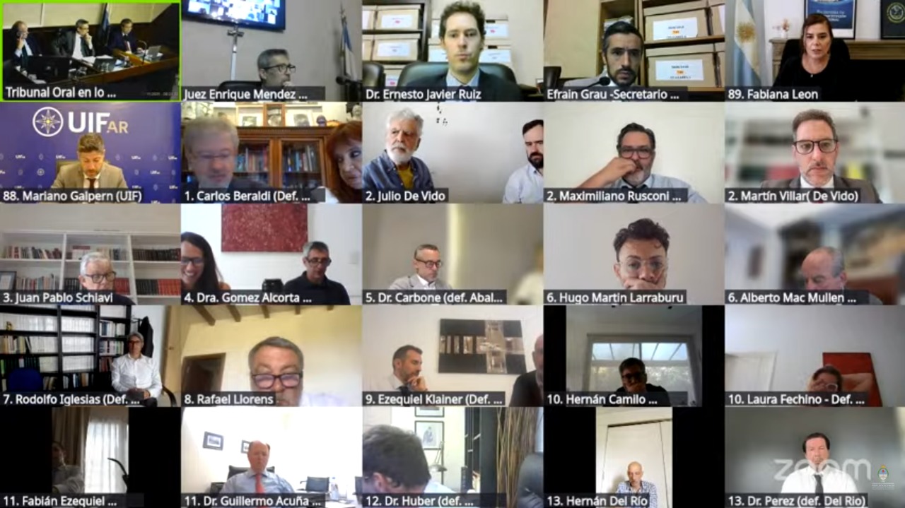 La quinta jornada del juicio por la denominada causa Cuadernos, continuó con la lectura de los requerimientos de elevación a juicio del MPF. Foto: captura de Zoom