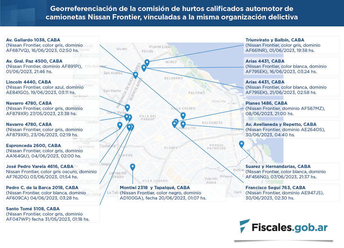 La causa se inició a partir del relevamiento realizado por la División Sustracción de Automotores de la Policía de la Ciudad de Buenos Aires, que estableció “patrones comunes” en una serie de hurtos y robos de camionetas Nissan Frontier 4x4, que estaban estacionadas en diversas calles y avenidas de la ciudad. Los episodios delictivos tuvieron lugar entre el 1° de junio y el 5 de julio pasado en los barrios porteños de Saavedra, Villa Devoto, Monte Castro, Villa Real, La Boca, Mataderos, Caballito y Villa Luro.