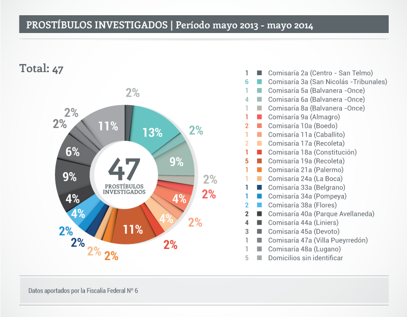 El equipo utilizó como herramienta de trabajo el sistema informático Fiscalnet para relevar los 43 casos, entre causas e investigaciones preliminares. El estudio comprobó que se investigaron un total de 47 prostíbulos, diversificados entre domicilios particulares donde funcionaban los denominados “privados” y “bares/whiskerías/prostíbulos públicos. La mayoría de estos prostíbulos funcionaban en los barrios de Tribunales, Recoleta, Once y Liniers.