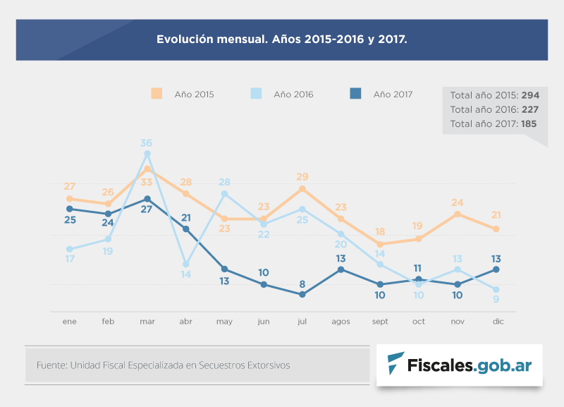 La comparación de los datos relevados durante el año 2017, con los de los dos periodos anteriores, permite concluir que la tendencia a este tipo de ilícitos ha disminuido desde que se creó la UFESE, en el mes de julio de 2016. En tal sentido, en el informe del año 2016 se consignaron 227 casos, mientras que el año anterior se registraron 294 secuestros extorsivos.