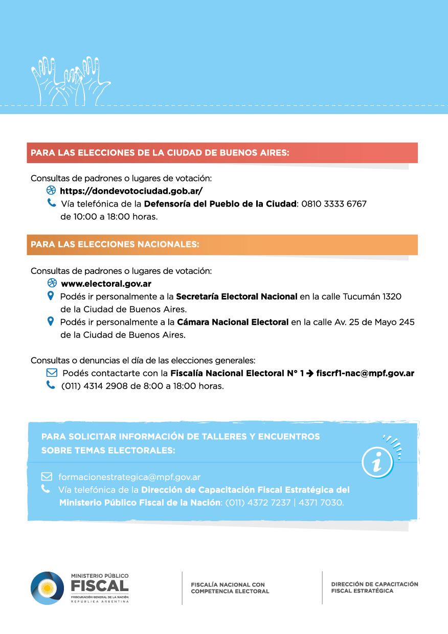A su vez, en caso de querer realizar consultas o denuncias el día de las elecciones generales, los ciudadanos podrán contactarse con la Fiscalía Nacional Electoral N°1, al correo electrónico fiscrf1-nac@mpf.gov.ar o bien al teléfono (011) 4314 2908, en el horario de de 8:00 a 18:00.
