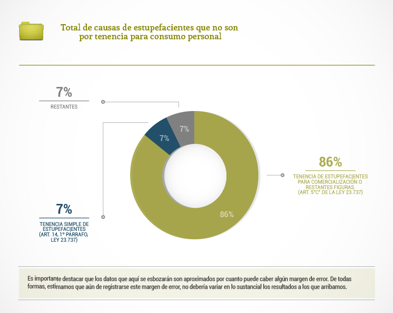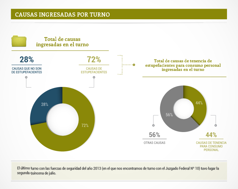 Un informe preparado por la Fiscalía Federal N°6 de la Capital Federal indica que durante el último turno de esa sede con la Policía Federal, el 72% de las causas iniciadas corresponden a hechos vinculados a infracción a la ley de drogas (N° 23.737) y que sólo el 28% se relacionaron con otros delitos. A su vez, de la totalidad de causas ingresadas durante el turno, el 44% se trataron de casos de tenencia de drogas para consumo personal.