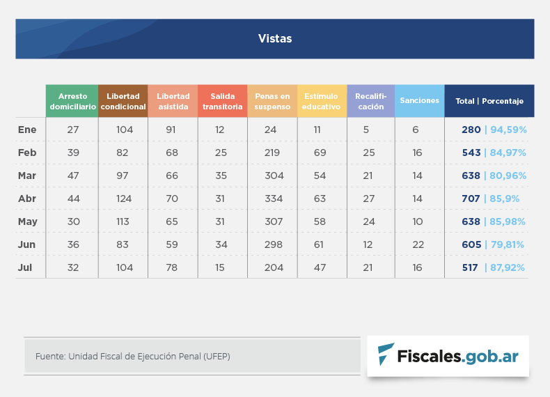 Por último, durante julio la UFEP contestó 517 vistas y procesó unas 1839 notificaciones. Entre las vistas respondidas se destacaron 204 sobre penas en suspenso, 104 sobre libertades condicionales, 78 sobre libertades asistidas, 47 al respecto de estímulos educativos, 32 sobre arrestos domiciliarios, 21 de recalificaciones y 16 sobre sanciones.