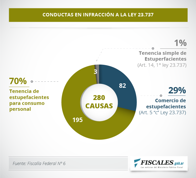 Un informe elaborado por la Fiscalía Federal N°6 de la Capital Federal, a cargo de Federico Delgado, indica que durante el último turno de esa dependencia del Ministerio Público con fuerzas de seguridad, el 65% de los casos involucraron hechos por infracción a la ley de drogas 23.737 (279) y el 35% restante se relacionaron con otros delitos de competencia federal (153). En este caso, los datos corresponden a las causas ingresadas en noviembre de 2015. El juzgado que intervino fue el Criminal y Correccional Federal Nº 8, a cargo de Marcelo Martínez Di Giorgi.