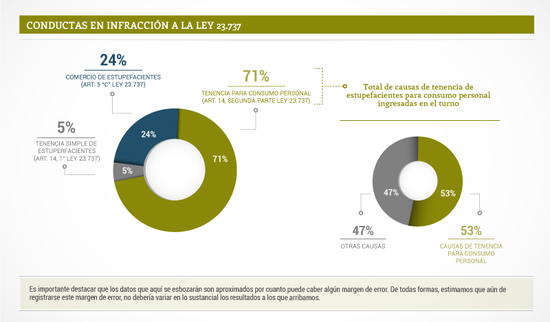 La Fiscalía Federal Nº 6, a cargo de Federico Delgado, elaboró un informe sobre la cantidad de causas que ingresaron a su dependencia, mientras se encontraba en su último turno con las fuerzas de seguridad, en junio de 2014. De las 277 investigaciones iniciadas, el 73% fueron por infracción a la ley de drogas (ley 23737) y el 27% restante se relaciona con otros delitos de competencia federal. Según surge del informe, de las pesquisas por infracción a la ley de drogas, el 71% de ellas (el 53% del total) fueron por tenencia de consumo personal.